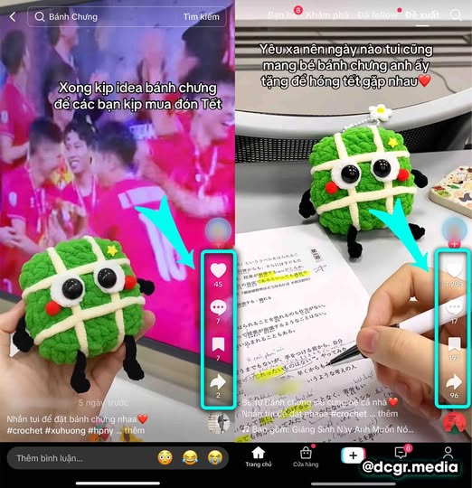Hai video trên kênh móc len với hình ảnh sản phẩm giống hệt nhau. Nhưng một video chỉ dừng lại ở việc giới thiệu mẫu mã, còn video kia thêm một câu chuyện: “Yêu xa nên ngày nào tui cũng mang bé anh ấy tặng để hóng Tết gặp nhau.” Kết quả? Video thứ hai bỗng có lượt xem và tương tác vượt trội hơn hẳn các video cùng kênh.
